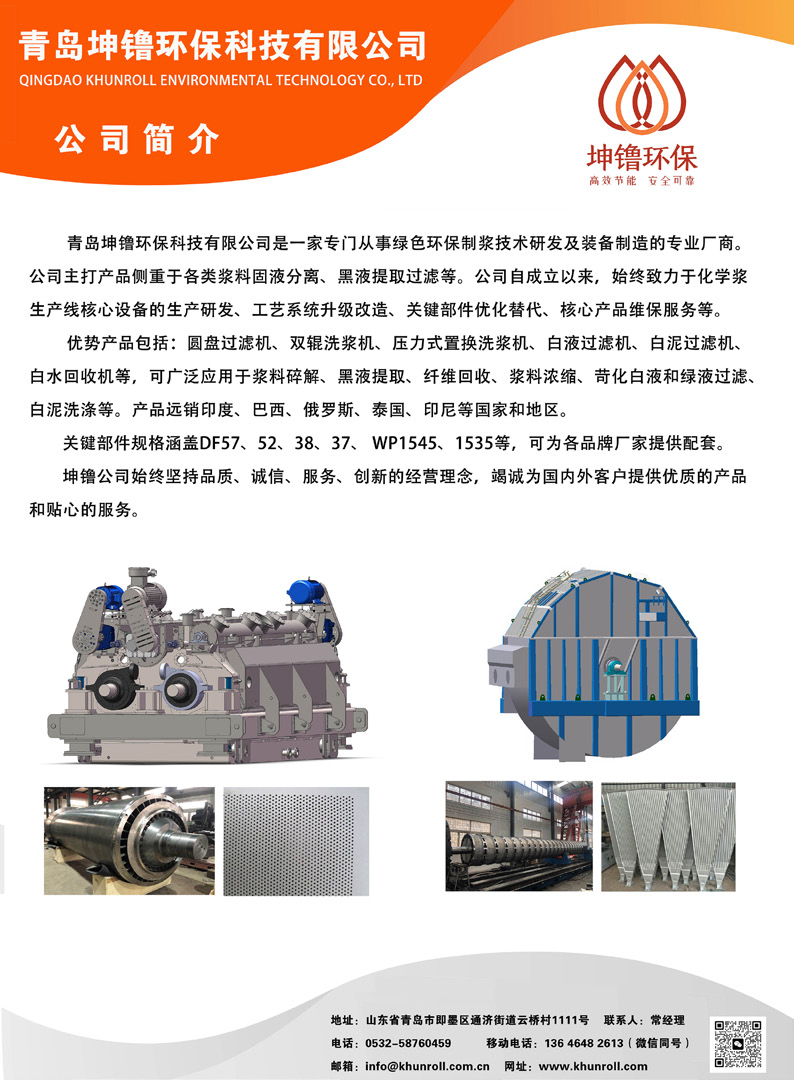 QINGDAO KHUNROLL ENVIRONMENTAL TECHNOLOGY CO.,LTD:Specializing in the research and development of green and environmentally friendly pulping technology and equipment manufacturing, our main products focus on solid-liquid separation of various pulps and black liquor extraction and filtration, etc.