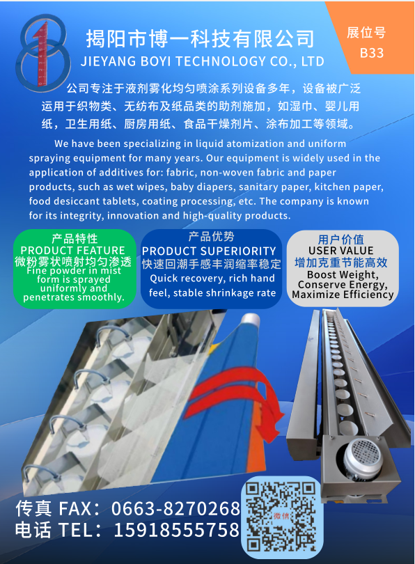 JIEYANG BOYI TECHNOLOGY CO., LTD: Focusing on the series of equipment for uniform liquid agent atomization spraying, the equipment is widely used in the application of auxiliaries for fabrics, non-woven fabrics and paper products.