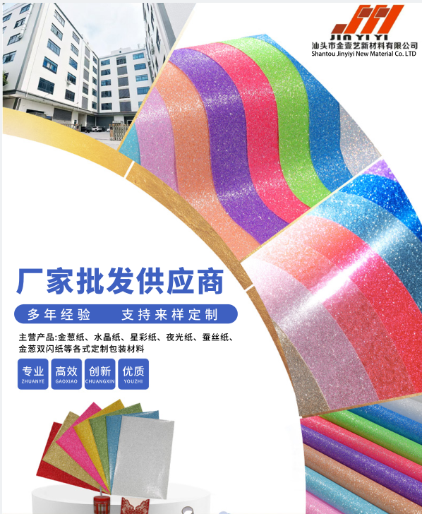 SHANTOU JINYIYI NEW MATERIALS CO., LTD:Mainly offering custom packaging materials such as gold onion paper, crystal paper, star color paper, luminous paper, silk paper, and gold onion double flashing paper, etc.