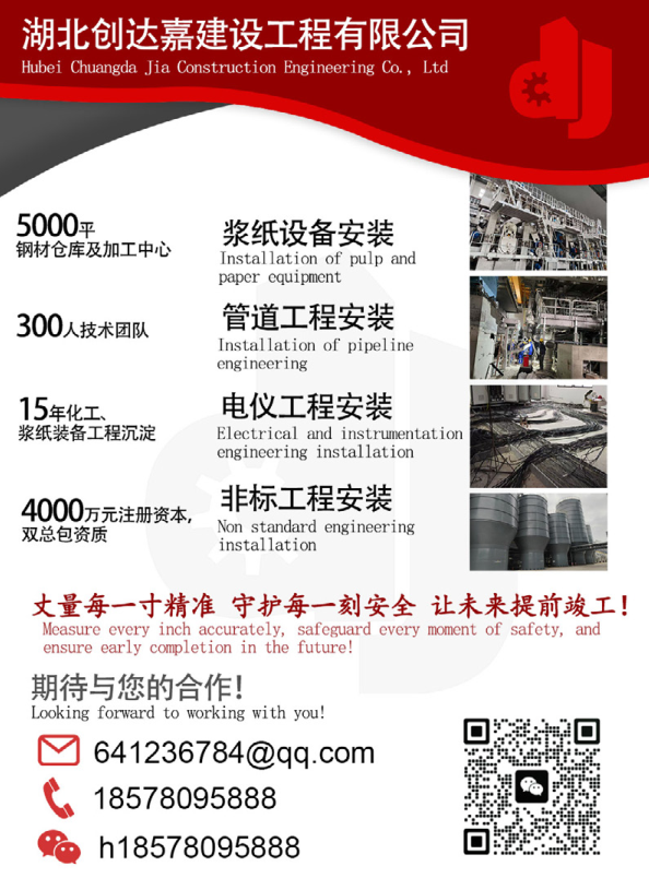 HUBEI CHUANGDA JIA CONSTRUCTION ENGINEERING CO., LTD:Engaged in the installation business of pulp and paper equipment, pipeline engineering, electrical and instrumentation engineering, and non-standard engineering.