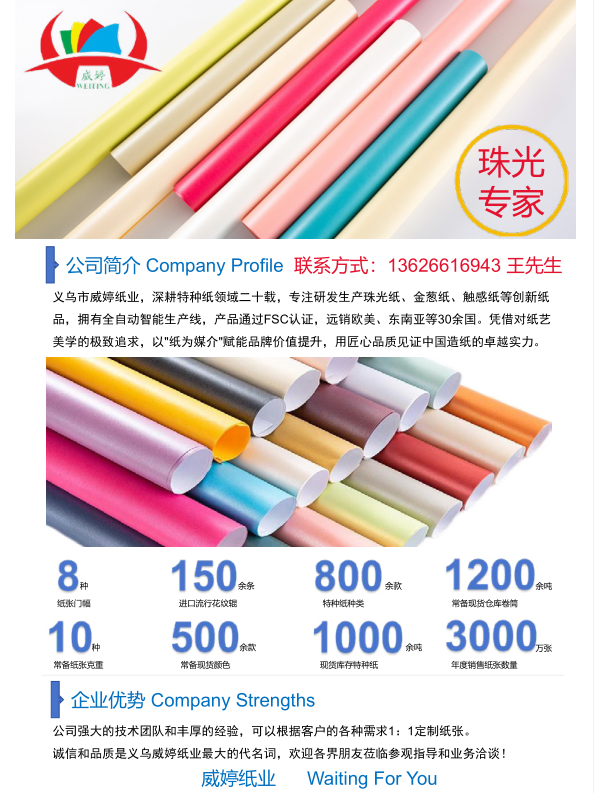 Booth No.D19,YIWU WEITING PAPER INDUSTRY:Focus on the research and development and production of innovative paper products such as pearlescent paper, golden onion paper and touch paper.
